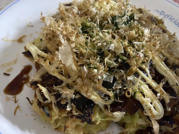 キャベツたっぷりお好み焼きです。母はあまり料理が得意ではなく、私達、三人の子育てで忙しくしていました。そんな母は、野菜不足にならないよう、お好み焼きをよく作ってくれました。
