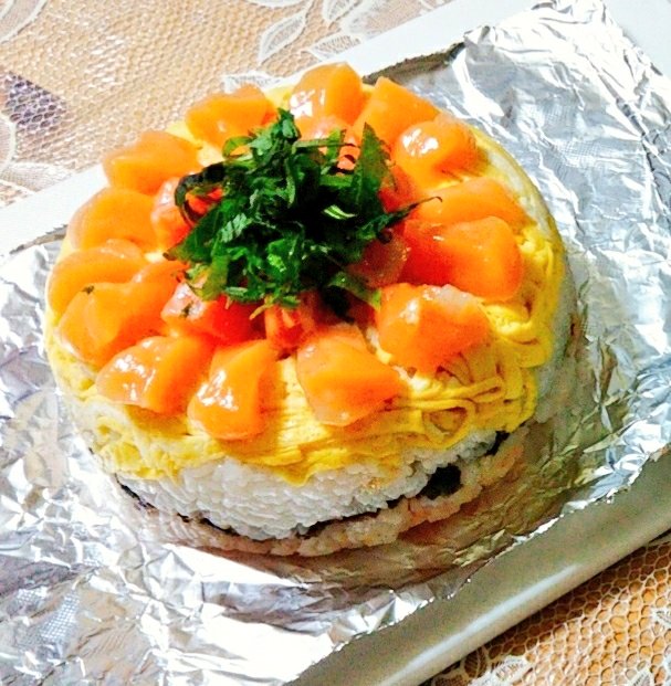 数年前の母の日に手作りしたお寿司ケーキです。この時母は大病からやっと復活し食事制限も無くなった時で、大好きなサーモンを使い見た目豪華に作ってみました。とても喜んでくれたのを今でも覚えています。