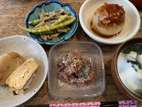 母の魚嫌いを克服ため鯵をたたきにして薬味と調味料で食べやすく仕上げました。その他おかずは母の好物、魚を食べたらそちらを食べて良いことにします。