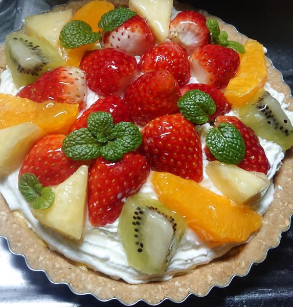 甘いものが大好きな母に作ったフルーツタルトです。タルトはビスケットとバターで簡単に、フルーツはスーパーのカットフルーツを活用して作りました!ツヤ出しにナパージュを作ってかけたら時短とは思えない仕上がりになりました(笑)とっても喜んでもらえてよかったです。