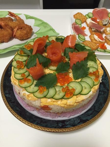 華やかに母の日をお祝いしたくて、寿司ケーキを作りました! サーモンの飾りはカーネーション…のつもりです(笑) いつもとは違った演出ができて喜んでくれたので、良い思い出です!