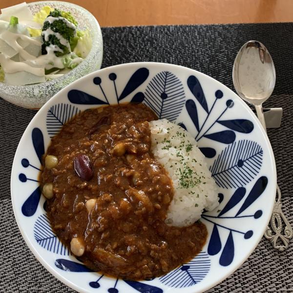 豆が大好きなお母さんにいつまでも元気でいてください。大好きなキーマカレーにお豆を沢山入れました。2人で食べようね。